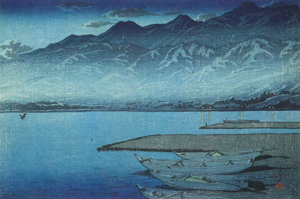 "Souvenirs of My Travels, 2nd Series: Lake Kamo under the Moonlight (Sado)" by Hasui Kawase (1921)