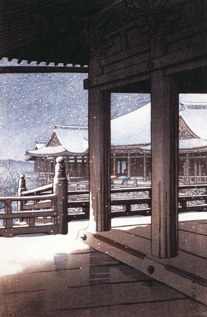 Download Button   "Evening Snow at Kiyomizu Temple" by Hasui Kawase (1950)
