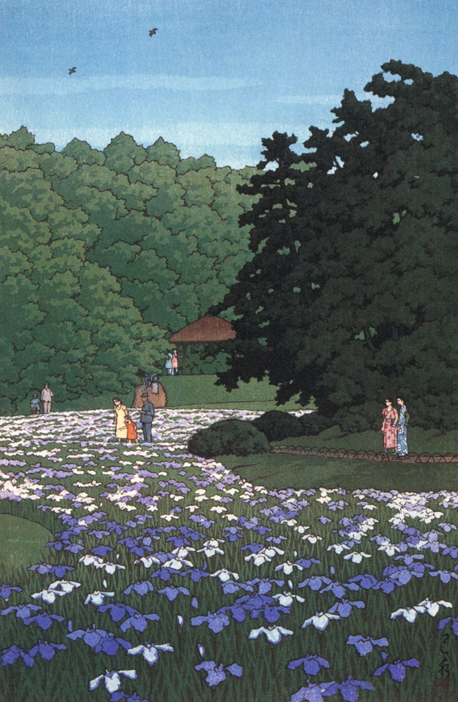 Download Button   "Iris Garden at Meiji Shrine" by Hasui Kawase (1951)