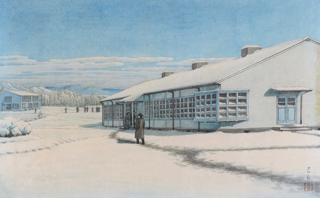 Download Button   "Junior College Building (Winter)" by Hasui Kawase (1950)