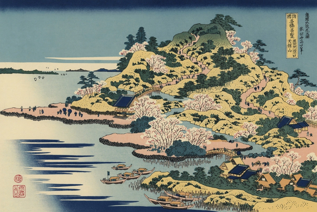 Download Button   "Unusual Views of Famous Bridges in Various Provinces: Tenpōzan at the Mouth of the Aji River in Settsu Province" by Katsushika Hokusai (circa 1833-34)