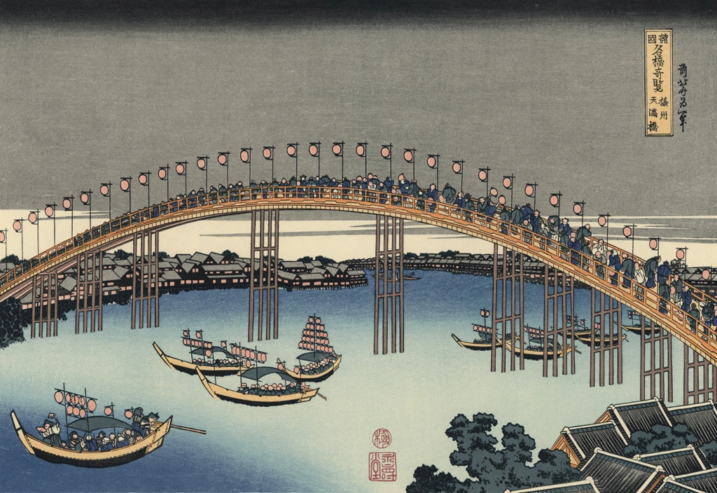 Download Button   "Unusual Views of Famous Bridges in Various Provinces: Tenma Bridge in Settsu Province" by Katsushika Hokusai (circa 1833-34)