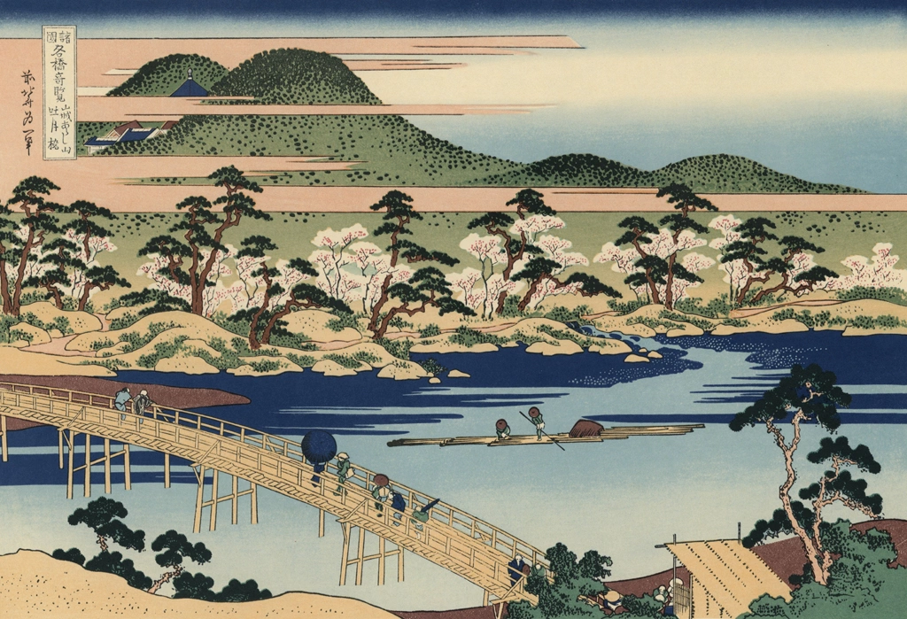 Download Button   "Unusual Views of Famous Bridges in Various Provinces: Togetsu Bridge at Arashiyama in Yamashiro Province" by Katsushika Hokusai (circa 1833-34)