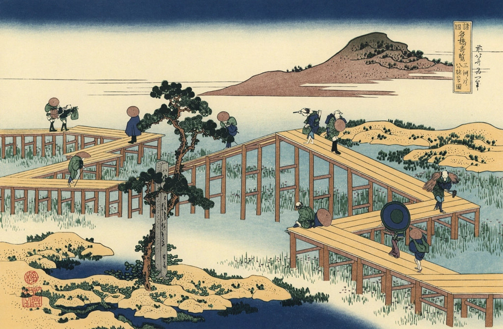 Download Button   "Unusual Views of Famous Bridges in Various Provinces: An Ancient Picture of the Eight Part Bridge in Mikawa Province" by Katsushika Hokusai (circa 1833-34)