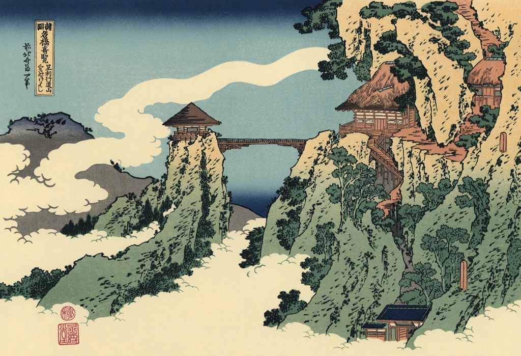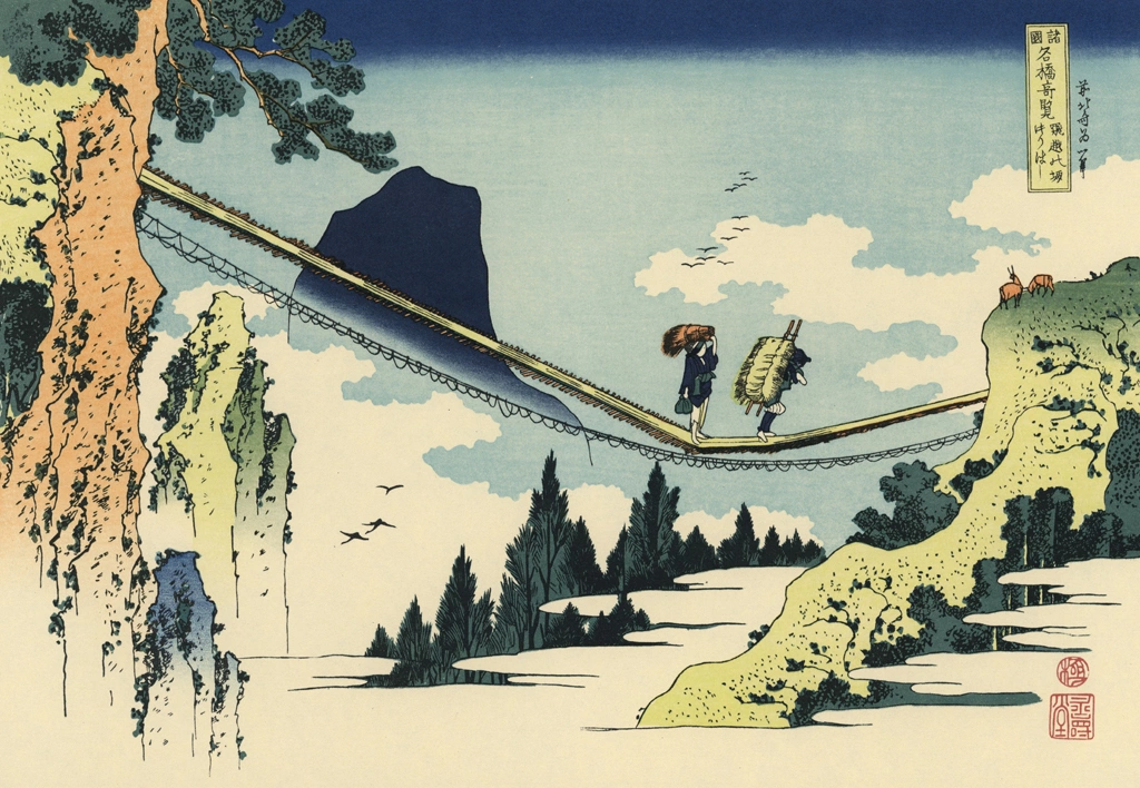 Download Button   "Unusual Views of Famous Bridges in Various Provinces: The Hanging Cloud Bridge of Mount Gyōdo near Ashikaga" by Katsushika Hokusai (circa 1833-34)