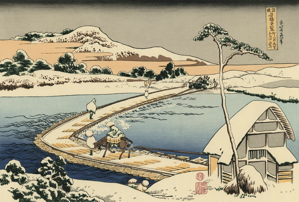 Download Button   "Unusual Views of Famous Bridges in Various Provinces: Fukui Bridge in Echizen Province" by Katsushika Hokusai (circa 1833-34)