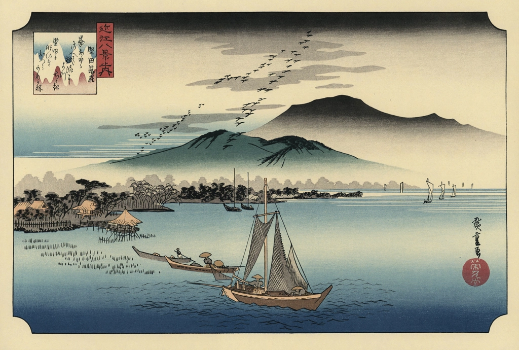 Download Button   "The Eight Views of Ōmi; Descending Geese at Katada" by Utagawa Hiroshige (c.1834)