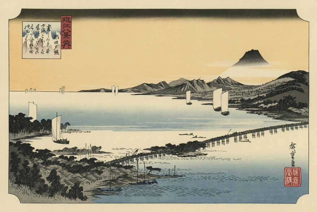 Download Button   "The Eight Views of Ōmi; Evening Glow at Seta" by Utagawa Hiroshige (c.1834)