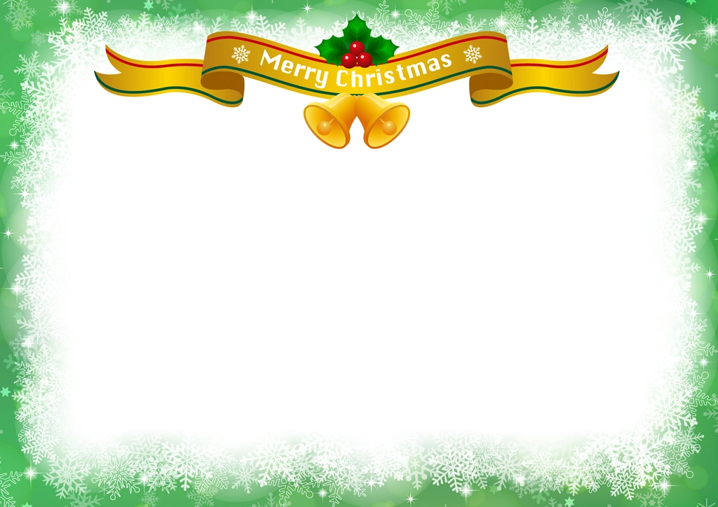 Download Button   緑色の雪の結晶とタイトルリボンのクリスマスフレームの背景