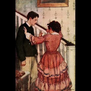 「若草物語 挿絵 #4 (手すりを持って、彼女は彼をそっと追い払った)」 ジェシー・ウィルコックス・スミス