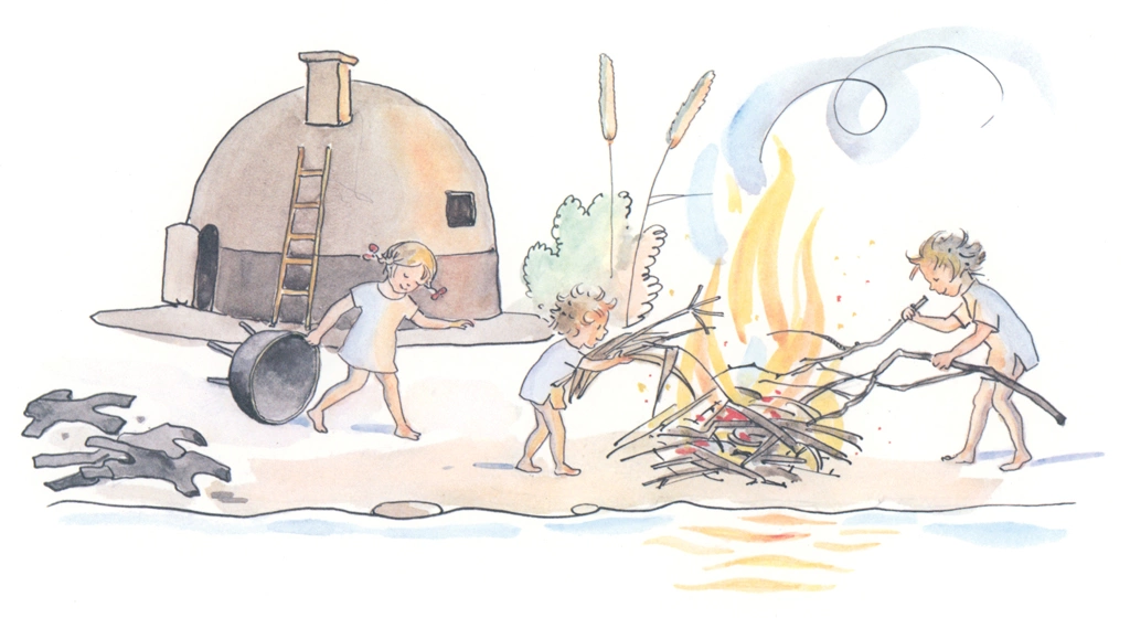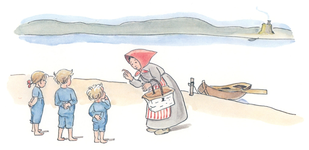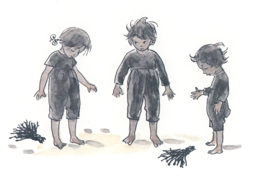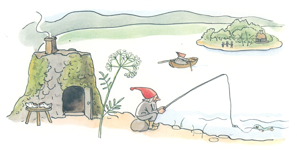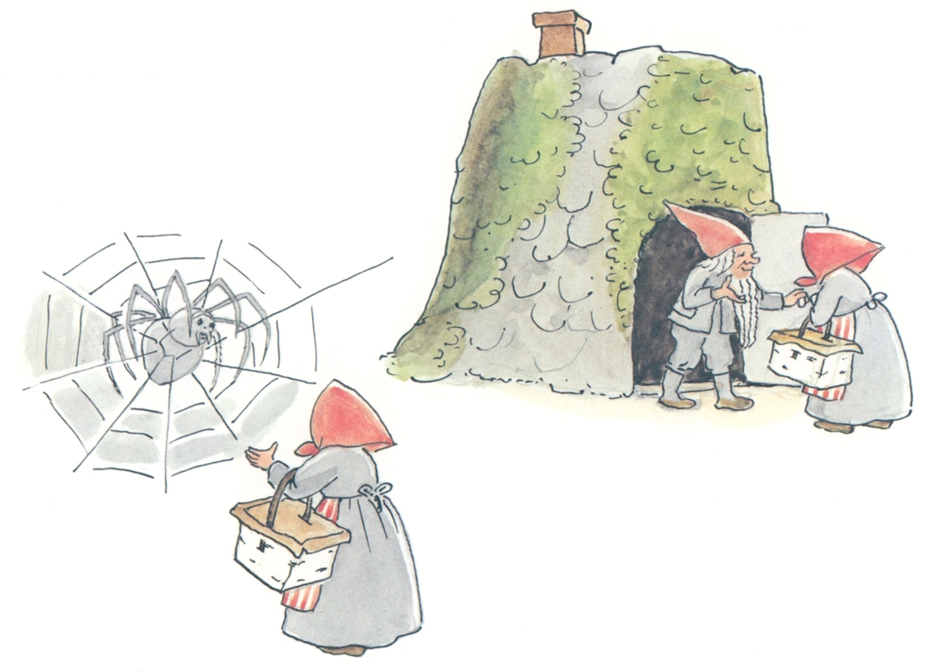 「ぼうしのおうち 挿絵 #05」 エルサ・ベスコフ (ワタスゲを紡いで糸にすることをカタツムリの男の子に勧められる小人のお母さん)