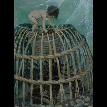 「水の子どもたち 挿絵 #7 (水の赤ちゃんになった煙突掃除夫トムと罠の中のロブスター)」 ジェシー・ウィルコックス・スミス
