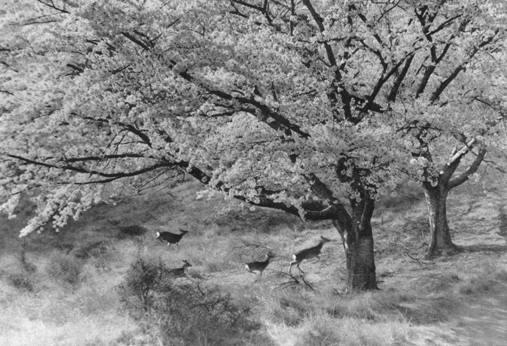 Download Button   「花に浮かれる(黄金山神社の桜の花と走る野生の鹿)」 島田謹介