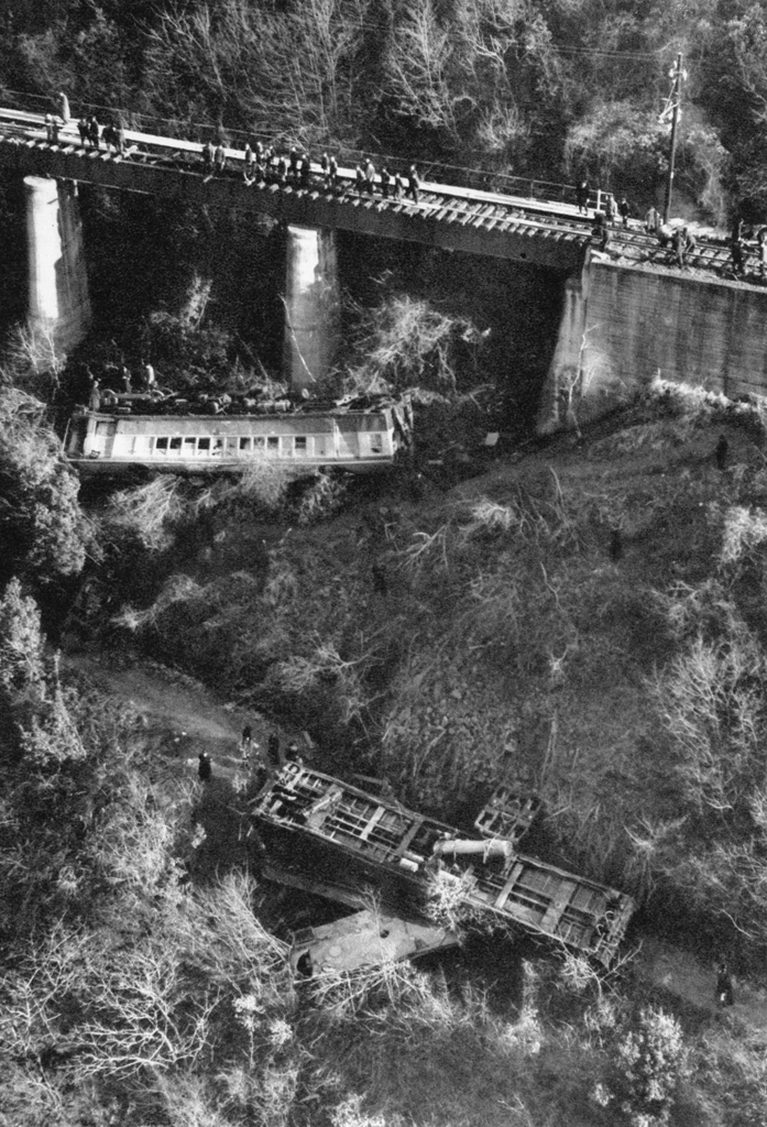 Download Button   「国電天龍川に転落 (飯田線大表沢鉄橋脱線転落事故)」 藤木高嶺 (1955年1月20日)