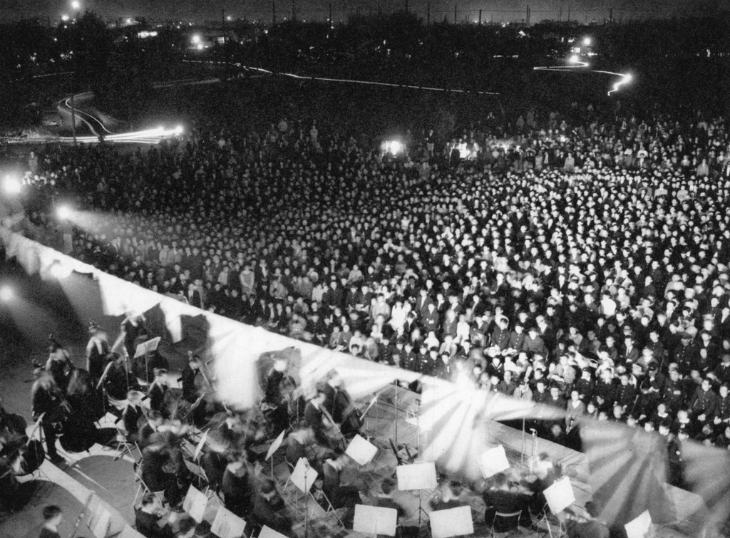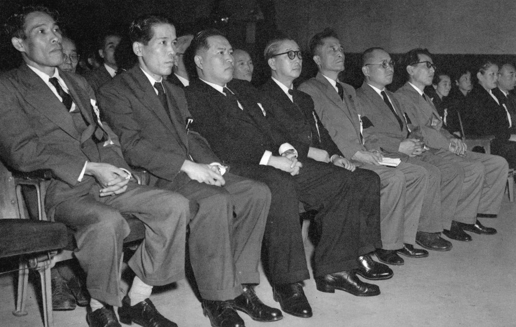 「ずらりと並んだ日共幹部 (故徳田球一氏党葬会場)」 前田和夫 (1955年10月14日) (左から春日正一、志田重男、宮本顕治、野坂参三、志賀義雄、紺野与次郎、西沢隆二)
