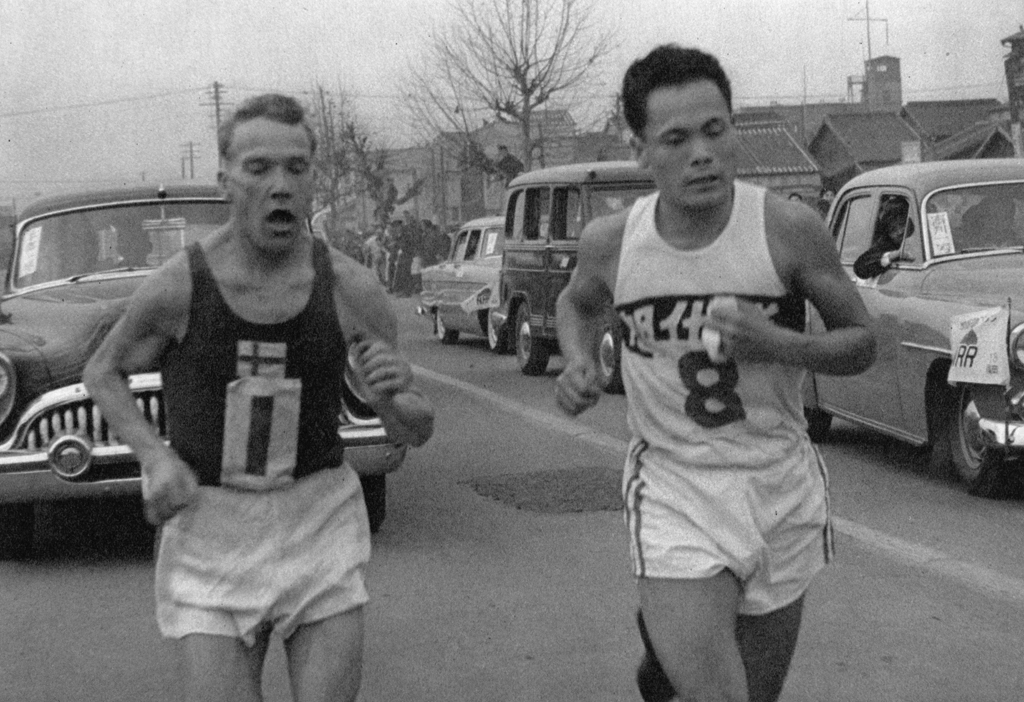Download Button   「カルヴォーネンと広島選手 (第九回朝日マラソン)」 西野清助 (1955年12月11日)