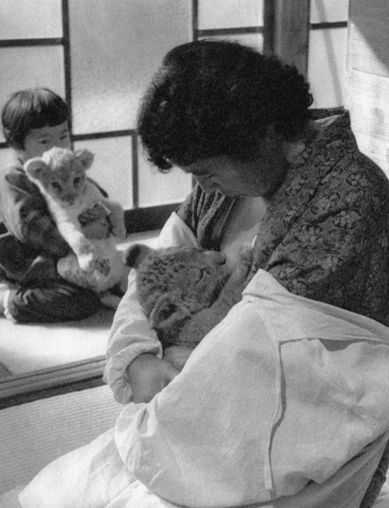 Download Button   「ライオンの赤ちゃん(育児放棄された赤ちゃんライオンに授乳する飼育員の奥さん)」 富重安雄 (1955年12月2日)